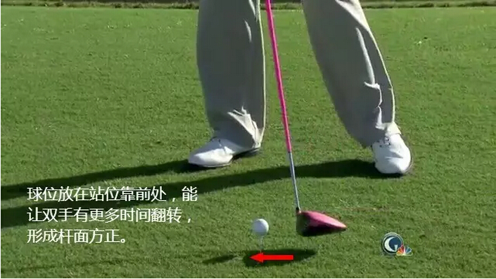沃森表示,如果遇到外曲球的问题,可以试试将球位移到站位靠前处,这样的话,在下杆触球过程中,双手就能有更多的时间进行翻转,让杆面方正,击球路线更直。