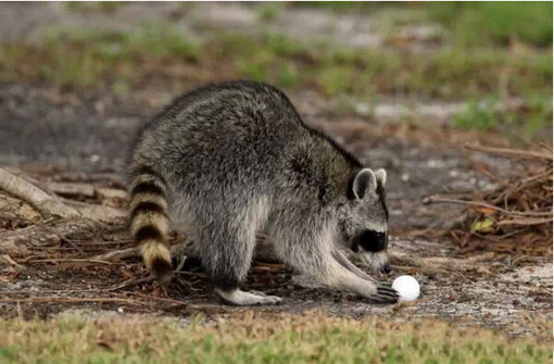 一只小浣熊在好奇地观察着高尔夫球