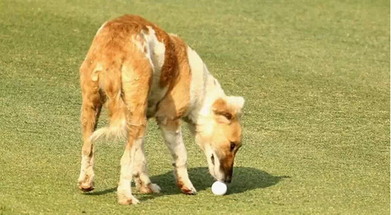 一只流浪狗在七号果岭上嗅高尔夫球