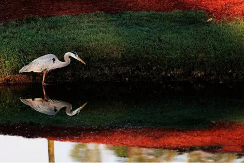 在清晨,一只大苍鹭安静地站在球场的水边