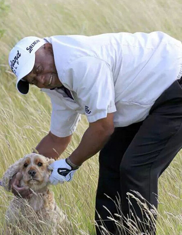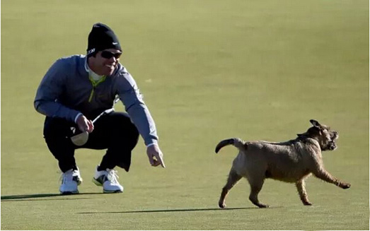英格兰球员Paul Casey在哄狗狗,希望它把球丢出来