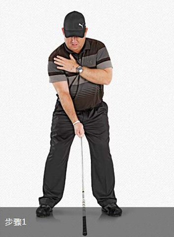 1. 拿一支铁杆,右手握住接座,站位,脊柱稍微向右倾斜。左手平贴右肩。