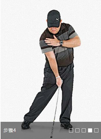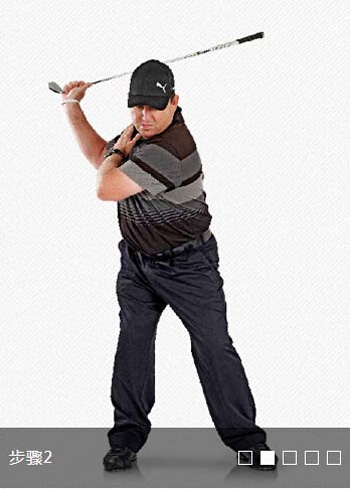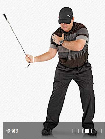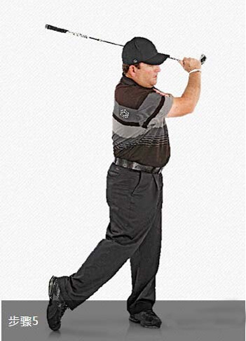 5. 右肩加速通过触球过程(利用左手的推力提醒自己使右肩保持转动),做出平衡的收杆。收杆时,胸部朝向目标,重心置于左侧身体。
