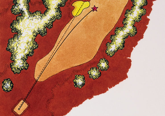 我非常想把球打直,但是事实却是不可能每一次都很直,这样的话,我就会打小左曲或者小右曲,我会把球道想象的非常宽,减少自己的压力。如果球道左侧有沙坑,但是我没有把握做出直球,那么我就会打一个右曲球来避开麻烦(如下图)