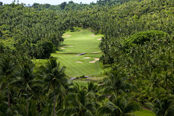 苏格兰人大卫·麦克莱基德设计了劳卡拉岛上的这座18洞锦标赛球场,球场地形险要,有7个球洞沿着俯瞰海岸的悬崖边缘分布。对着太平洋开球,那种波澜壮阔的感觉可想而知。如何将球场和悬崖海岸进行完美的结合与诠释,设计师已经轻车熟路,俄勒冈的班顿沙丘球场 (Bandon Dunes)就出自他之手。劳卡拉岛球场布局精心融入当地环境,球道与岛上的椰子林融为一体,依山势起伏而建,果岭和沙坑的设置都充满趣味和挑战。在标志性的12洞签名洞,球道延伸到悬崖尽头,开球的时候可以听见呼啸的海风,令人心潮澎湃。