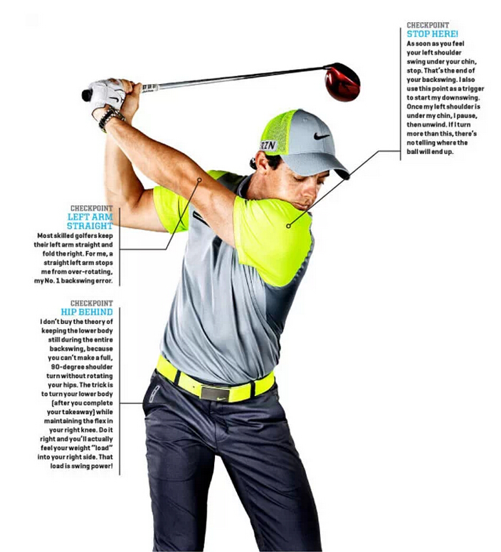 关键点:左肩移到下巴下方时就停止上杆,此刻我双肩转动了90度,右膝弯曲,蓄积了大量能量,我可以在任何一个五杆洞两上。你会觉得挥杆变紧凑了,而非短了,这是好现象。