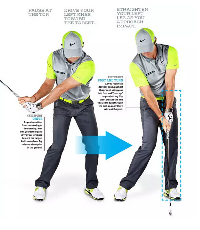 上杆置顶后开始下杆,转动左腿,让左膝指向目标,你要卯足劲,在地上留下一个脚印。