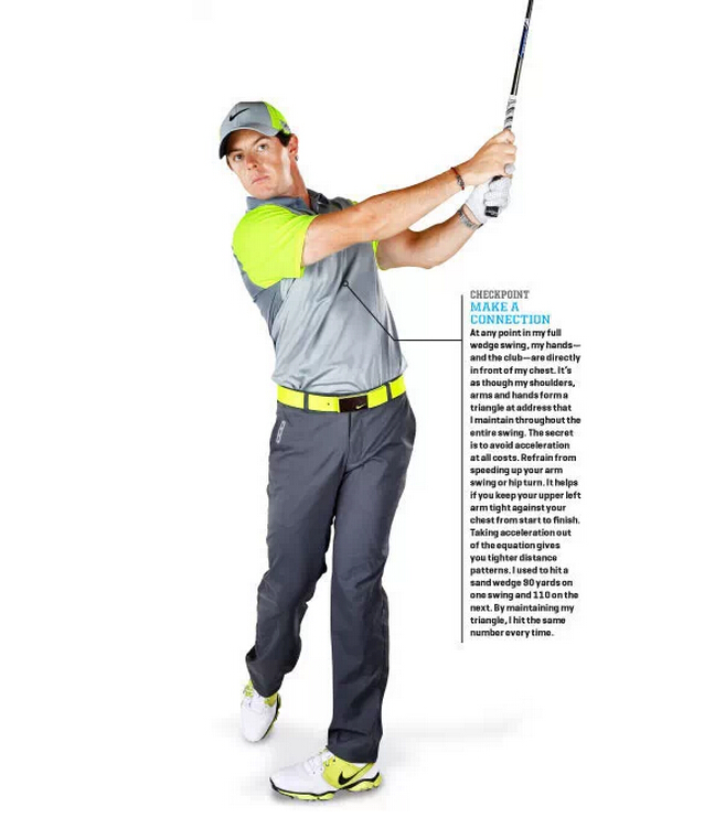 在我全挥杆的整个过程中,手和球杆一直都位于胸前,这样我的每个动作才能做到位。将左上臂从一开始到结束都置于胸前将帮助你完成这个动作。我曾因此可以用沙杆打出90码和110码的距离。做到这一点,我经常可以打出这样的成绩。