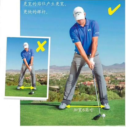 当我想把球打远的时候,我会先采用自己常规宽度的站位,然后右脚向右移动6英寸(约15厘米)。这个小的调整让我有更加稳定的挥杆基础,改善平衡,并且让我拥有最宽的挥杆弧。更宽挥杆弧的好处在于,它可以让你在下杆的时候拥有更长时间的加速过程。