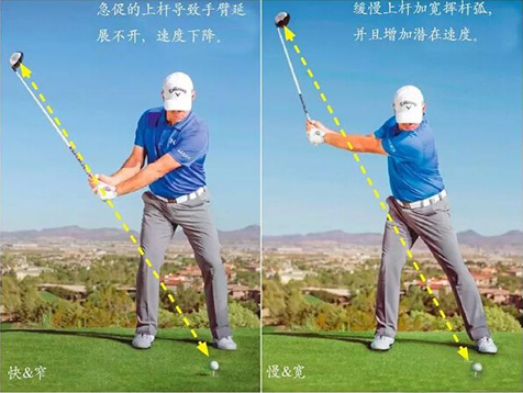 如果我急促地上杆,我的手臂很难完全伸长,挥杆弧也变得更窄,这会对我的下杆速度造成很大限制。另外,这还将造成我很难充分地转动肩膀或者做出很好的上下杆转换动作。记住,将上杆过程视为一个能量的储蓄过程,不要很快让它达到顶点。