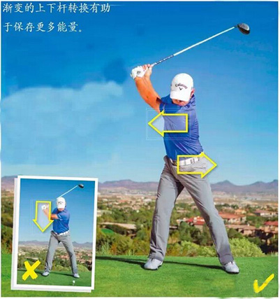 你不应该让自己的上下杆转换动作有明显的“冲突”的感觉,而应该是渐渐地改变运动方向。在我进入下杆动作之前,我会确保自己的所有能量都在向下以及向前转移。如果你在挥杆顶点过于用力,你将过早损失掉很大一部分挥杆能量。当你下杆到击球位置的时候,能量已经耗尽,你很难打出又直又远的击球。
