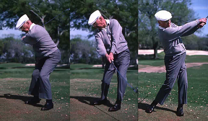 此时,霍根强调,在上杆中双肩的转动总是先于髋部的转动。当双手上杆到齐髋部的高度时,肩部的转动会自动带动髋部进行转动。这一点在霍根看来非常重要,即“被动转髋”。