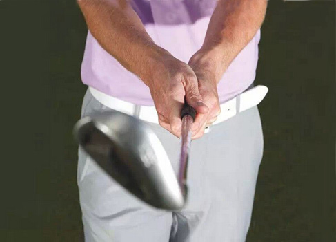 如上图所示,持握球杆时,采用稍微弱势的握杆。即右手拇指和食指之间的“V”字指向胸部正中,而不是通常右肩。这会帮助你找到将球打高的感觉,只有非常“轻柔”的触球才能让球落地后迅速停住。