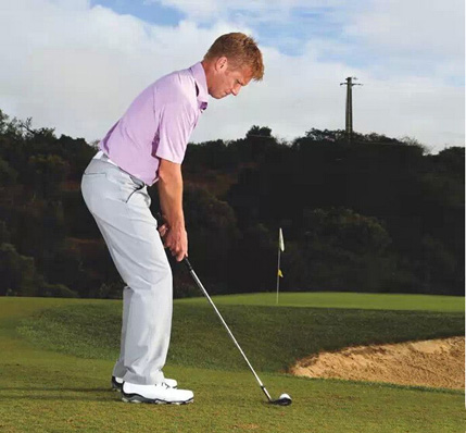 你需要在预备击球时保持“柔和”,双膝适度弯曲,不要让紧张感影响你的握杆力度。双脚和双髋向目标左侧校准,重要的是杆面朝向目标右侧。这种校准组合会给你带来你需要的弹道和击球方向。最后,让胸骨位于球位之上,这能保证在挥杆弧的底部触球。
