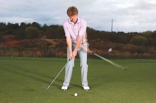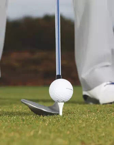 这一绝佳练习能够帮助你学会从低平的角度击球。如上图所示,将球高高架起,试着用杆头击打球座,而不是击球。球杆应该从球下的地面扫过,挥杆完成后球应该落到原来的地方。