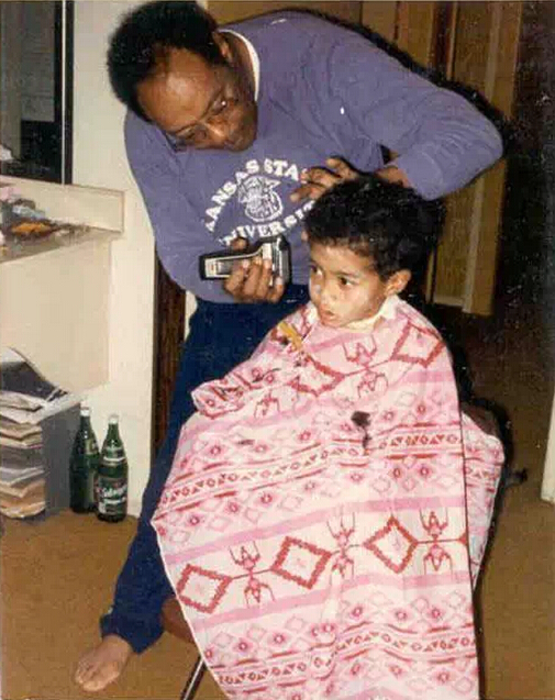在堪萨斯州打职业棒球的父亲正给小老虎修剪头发。
