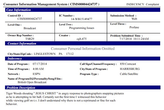 自2011年以来,美国联邦通讯委员会(简称FCC)已经接到了22宗关于高尔夫节目出现不当词汇的投诉,这其中CBS、NBC、高尔夫频道和ESPN的节目都赫然在列。而从美国媒体拿到的FFC报告来看,这其中有15宗(占全部投诉的70%左右)投诉都来自于伍兹的俏皮话。