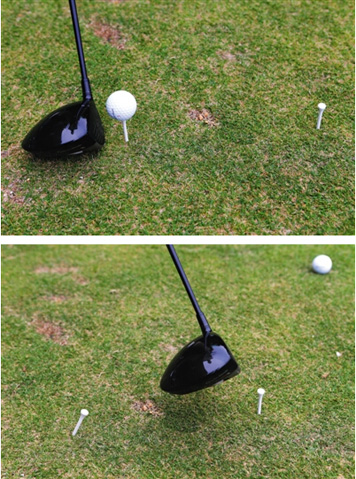 将两个球Tee依次摆放,距离约为一脚宽,当你击球时,只允许球杆碰到第一个Tee,如果碰到第二个就算违规,我们的目标是改善你的击球角度,对,要尽可能地使你的杆头扬起来,才能获得更完美的起飞角度。