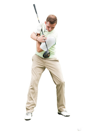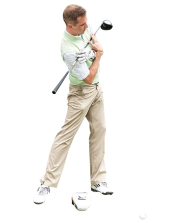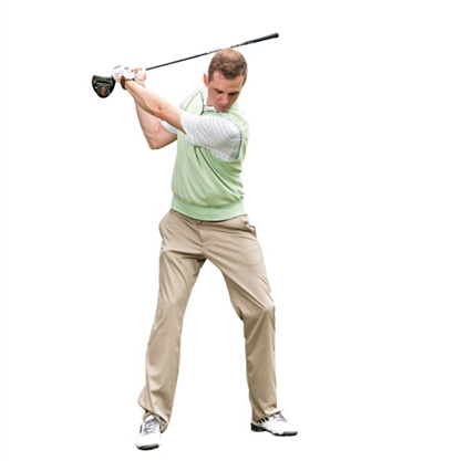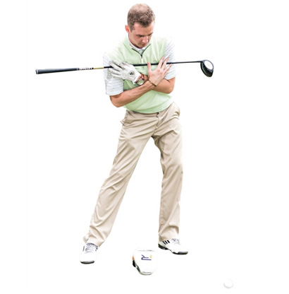 1. 双脚开立,比肩稍宽,双膝微屈。双手在胸前十字交叉,横抱球杆。向右转肩,直到最大角度,坚持数秒。杆套放在脚下,作为衡量左肩是否摆动到位的参照物。