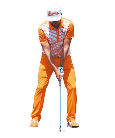 预备击球时,福勒双脚站位稳定,站位宽度大于双肩宽度,同时保持有力的双膝微曲姿势。福勒的右脚与目标线垂直,这能防止上杆时身体重心向右侧转移过度。同时,左脚脚尖向目标方向略微张开,这能促使在下杆过程中充分向目标方向转体。注意福勒的握杆动作,他的左手为明显地强势握杆,左手向右侧转移幅度较大,左手手背几乎指向正前方。但他的右手握杆较中性,拇指和手掌间的夹线指向头部。这种左手强势、右手中性的“不协调”握杆很少见。