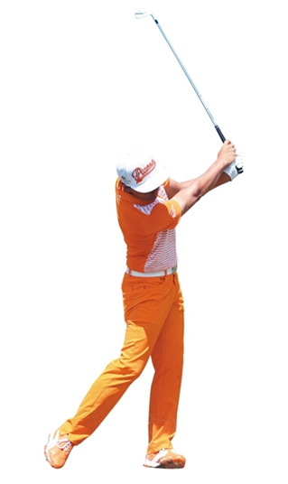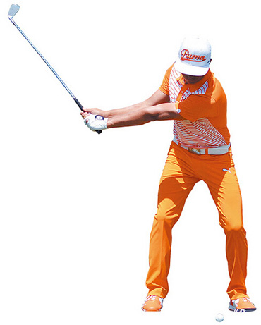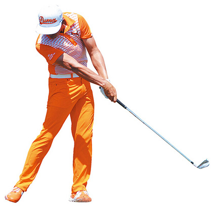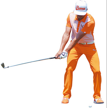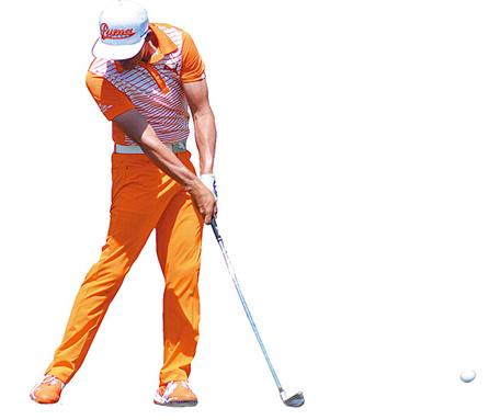 转髋,持续转髋,这是福勒在触球前的瞬间仍然在做的。与此同时他的双腕开始加速释放杆头,但仍然保持引领杆头、杆身前倾的触球姿势,这将保证球被杆面充分挤压,而不是由球杆将球挖起来。注意到福勒的左臂了吗?没错,所谓的鸡翅膀!他在触球过程中并未伸直左臂,这让我们想起了同样以“鸡翅膀”左臂触球的知名英国球星李·维斯特伍德。所以,如果你也有鸡翅膀的动作,无需过于在意。