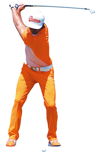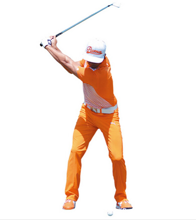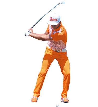 在上杆至3/4时,福勒开始有明显地立腕动作。何谓立腕动作?即双腕翘起杆身与左臂的夹角缩小,此时福勒左臂与杆身的夹角约为90°。他的左肩已经转动至下巴下方,但仍在持续转动。福勒很好的控制自己的重心在右大腿内侧,要防止重心倒置(向右移动过多),不妨模仿福勒的上杆动作。
