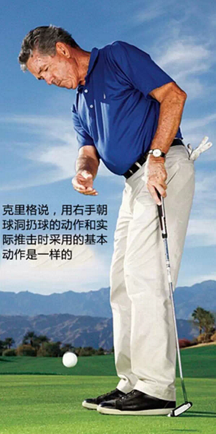 我不建议在推击时考虑特定的身体部位——你要的是自然、不假思索就能重复做出的动作,就像鼓掌。找到你的自然推击动作的简单方法是:在常规推击 站姿下用右手朝球洞扔一颗球(如上图)。用来朝球洞扔球的动作就是你实际推击时应该使用的动作,它是身体核心、肩部、手和手臂的任意组合,每个球员都不一 样。高手们不会考虑推击的技巧。他们只想推球进洞。仅此而已!