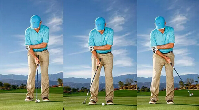 正确的推击距离和球杆的释放有关——触球后杆头超过双手越多,推击越平稳,也越精准。以下是杰伊·哈斯教给我的一个练习:采用常规推击站姿,将 左手放在右肘部(如下右图)然后推击。由于不用左手并且右肘固定,你会发现释放推杆头(让杆头超过双手)变得更容易,使得杆头在击球后沿着推击线“追赶” 球。这个平稳无抽动的动作将让你的球从果岭上任何距离接近洞杯,即使是最长的长推。
