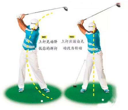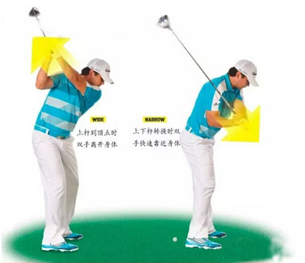 弧度较宽的挥杆往往更加有力,但简单追求更宽的挥杆弧并不会真正帮你提升挥杆速度。其中的诀窍是,在上杆的时候伸展自己的左臂,并让握把尽可能地远离头部,然后在开始下杆的时候,让握把靠近自己身体将球杆拉回来。从上杆顶点宽的位置,到下杆时窄的位置,可以让你的挥杆速度飞速提升。但切忌在上杆的时候过于追求宽的挥杆弧,以至于右手也伸直,让它像平常一样折叠。