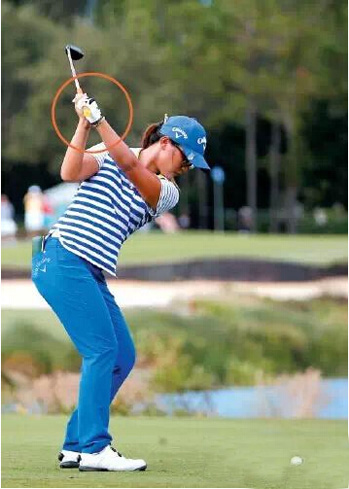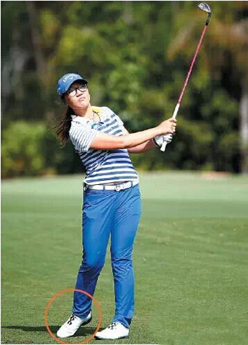 球友们可以观察高宝璟的短铁杆击球,她的下盘非常稳定,从双脚的动作上可以看出这一点。在通过击球时,她的右脚仍然踩实底面,即使在收杆时,她的右脚仅抬起约45°的高度(如上图所示)。你可以模仿高宝璟的这一动作,记得在击球时保持右脚踩实地面,感觉右脚缓慢地翻转直到收杆结束,你会发现你的短杆击球更加稳定和精准。