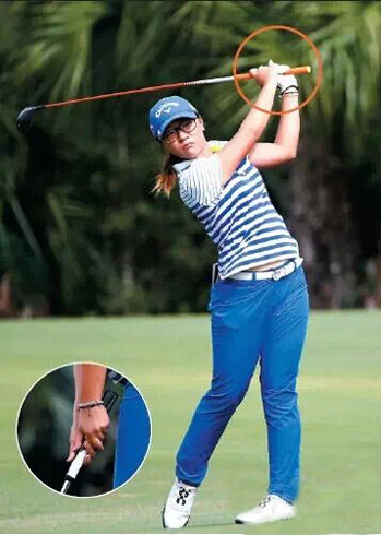 注意高宝璟持握球杆的位置,没错,是握把中间,这是所谓的握短杆身。握短杆身会缩短挥杆半径,击球距离会随之减少。这也是高宝璟从儿时就有的习惯性握杆姿势,你会发现她持握每一支球杆时都握在握把的中间,甚至推杆也是如此(上图中小图所示),高宝璟称握短杆身让她感到更舒服。握短杆身后挥杆更加自信,对于长杆击球来说尤其如此。