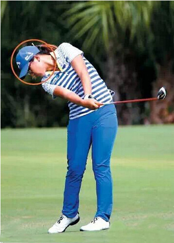 在送杆至杆身与地面平行时,高宝璟仍然能保持头部位置。如果仔细观察会发现,高宝璟此时仍睁大了眼睛,盯着球位。在通过击球时睁不睁眼每个人都有不同的习惯,伍兹就会在击球瞬间闭眼。如果你平时是闭眼的,不妨尝试在整个挥杆过程中都睁大双眼,像高宝璟一样盯住球位,保持头部位置固定。