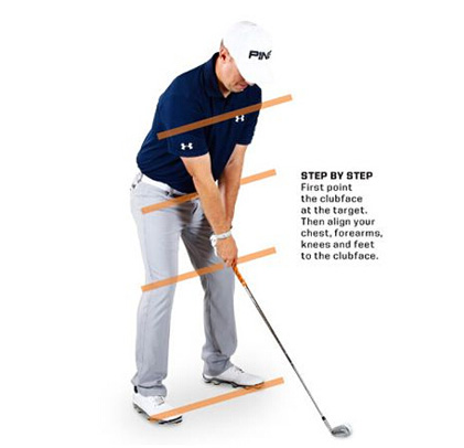 我经常被问道,普通球员和职业球员的区别到底在哪里。技术水平方面不说,最明显的差异在于练球的方式。你训练的是“挥”杆,而优秀球员则是以目标为导向做击球训练。结果就是,业余球手击球弹道远离目标区域。修复方法并不是在准备击球时“方正杆面”那么简单。那么诀窍在哪?首先,应该将杆面“方正”朝向目标方向,然后再调整身体的站位,使身体与杆面方向垂直。按这个流程做会比反过来做容易多了。可以尝试这么一个视觉假想:一旦确定好杆面朝向后,想象有四条直线附于你的胸前、手臂前、膝盖前以及双脚前(如上图)。调整站姿,直到这四条线都平行于目标线,就像四条平行的火车轨道那样。这种击球准备策略可大大提升将球击至目标区域的概率。