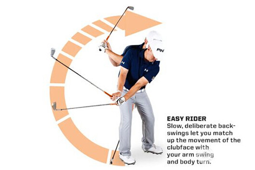 在上杆过程中,如果在杆头运动的前几尺范围内,手臂和肩膀保持相对固定的话,那么剩下的挥杆动作就会自动规范。但大多数业余球手是怎么做的呢? 他们总在最一开始的时候就急于上杆。尝试这么去做:在击球准备时,大声地从3开始倒数,然后慢慢地同步移动肩膀、胸腔、手臂及杆头。倒计时可以建立起上杆的韵律感,不至于贸然地上杆。你可以感觉到球杆与身体同步转动。如果手臂与杆头同时抵达最高点,那么上杆动作就做对了。