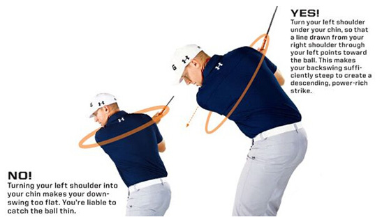 我并不怎么赞成“将左肩膀转至下巴下”这句话。虽然理论上看,这句话也是对的,但这样却容易产生较平的转身,而不是用铁杆击球所需要的“陡立转身”。而如果你的肩膀转动没那么陡的话,你便会不自觉地在后挥杆时提高上半身,使得杆头偏离正确的挥杆平面,这通常会导致薄击球。我有哪些建议呢?不要将左肩贴近下巴,而是要将左肩转至下巴以下位置。如果在上杆顶部位置时,左肩指向球,而不是指向球的后方位置,那么就算做正确了。这种感觉就好像你要将身体百分百的重量推向地面。