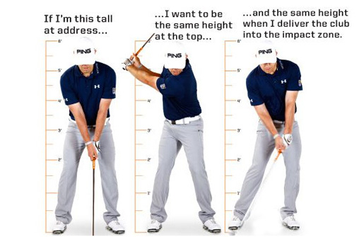 砖家们爱谈落杆过程中的各种“角度”。而我们则强调要保持身体高度不变,因为在你抬高或降低身体的时候,就与正确击球失之交臂。在落杆过程中重点关注两大区域。首先,在击球前保持膝盖的弯曲——既不能僵直,又不能太弯曲。双脚立地要稳固。其次,确保你的胸腔在击球时的高度和在上杆顶部时的高度一样。如果你在落杆时有抬升胸腔的趋势,那就意味着你在击球准备时站得离球太近了。另一方面,如果在落杆时会降低胸腔(这会导致厚击球),那就说明你的站位离球太远了。告诉大家一个简单的检验方法,在击球准备时,检查双手位置是否正好落于脚趾头前。