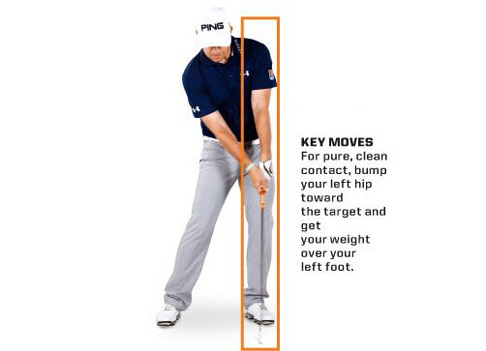 没错,在落杆时确实需要转动臀部,但没必要看得太重。对于初学者,臀部要尽可能地转的大。在落杆伊始,臀部就要转向目标方向,因为这会将身体能量传达至目标方向。更重要的是,它可使得你的挥杆轨迹的最低点落于球位的前方。所以说,正确的顺序应该是杆头先击中球,再切中草皮,而不是相反。