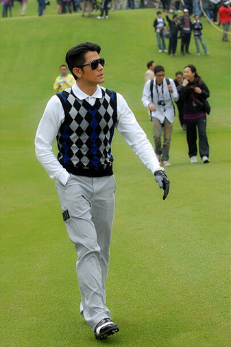 舞台上各种霹雳,草地上就又是衣服安静悠闲的样子,郭富城的穿衣品味向来为人称赞,运动时也不例外哦。经典的格菱纹毛背心搭配白色polo衫,这一套穿出了时装的感觉呢。