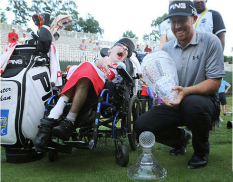 亨特·马汉(Hunter Mahan)赢得冠军,在庆祝时,准备与患有肌肉萎缩症的戴维·芬恩一起合影留念,一不留神,奖杯滑落触地,玻璃材质的冠军奖杯断成两截,真是乐极生悲啊。好在马汉心大,看起来并不在意,这个小小的意外也算是“杯具”变喜剧。
