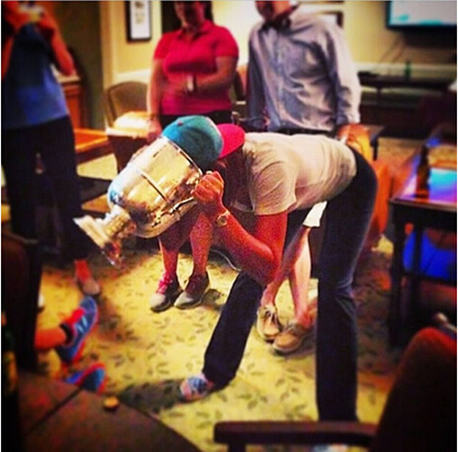 英格兰球员伊恩·保尔特(Ian Poulter)是高尔夫球界有名的恶搞达人。2010年莱德杯冠军由欧洲队夺得,身为欧洲队队员的整蛊大王保尔特将蜂蜜燕麦圈(Honey Nut Cheerios)倒进奖杯后,又加入牛奶,随后和儿子一起拿起勺子大快朵颐美美地吃起来。将莱德奖杯当做早餐碗,这一对吃货父子也真够可以的!