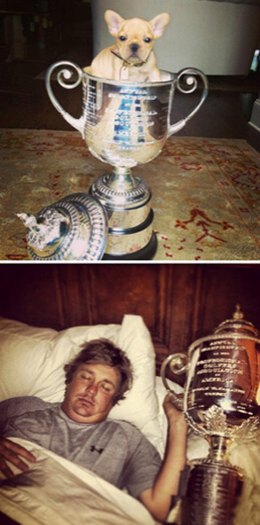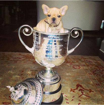 夺冠后,杜夫纳将他新养的宠物小狗“路易王子”放进了沃纳梅克奖杯,看来呆萌的走神帝杜夫纳也是个标准的炫耀帝?——奖杯萌宠一起晒!