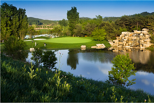 大雁栖息的地方自然是风景秀丽,环境出众,雁栖湖球场就是在这样一个纯天然环境中栖息着。球场充分利用了山地地势及各种植物的原生态,而且球道都被细致地设计在山坡上。在铺设球道过程中,球场尽最大可能保存了成熟的树木。所以,山坡上的球道要比平地上的球道要窄,果岭及沙坑也相对要小。而平地球道旁设计了很多湖水,并提供了开阔的球道面积。