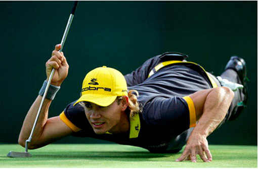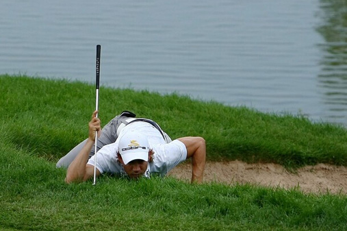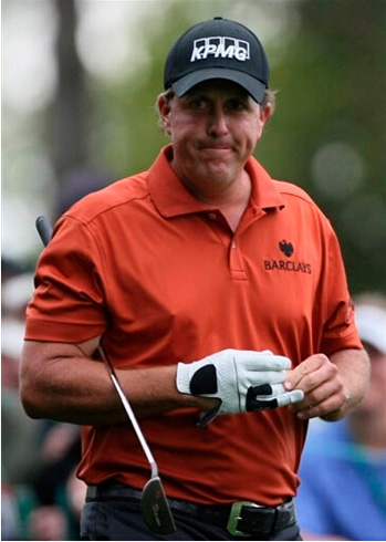 纵观众多高球明星,要搞怪,你肯定首先想到“左手怪”米克尔森。最有趣是那张天生就搞怪的嘴,爱嘟着,总给你老小孩的印象,再加上他面部其他四 “官”的默契配合,一张脸就足以成为他的招牌。要说,不管是胜是败,在比赛过程中他总爱抿着嘴,眼睛张得圆溜溜的,或是专注,或是排解心头的郁闷,偶尔他 也嘟嘴啦,尤其是在犯“白痴”的时候。