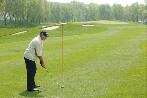 图6:杆面瞄准旗杆右面20码的方向,站位和杆面方向平行 。