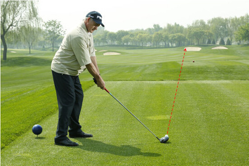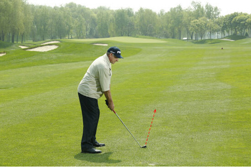 图2:当你逆风打球时,将球放在比你正常的球位偏右一些的位置。