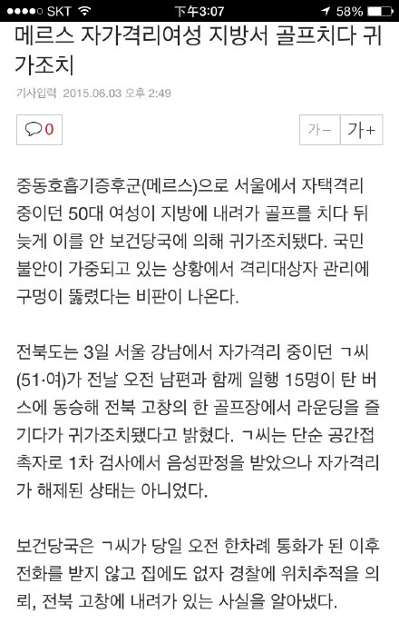 报道称,韩国政府接连不断在对MERS隔离对象的管理上出现漏洞,国民不安心理日益加重。