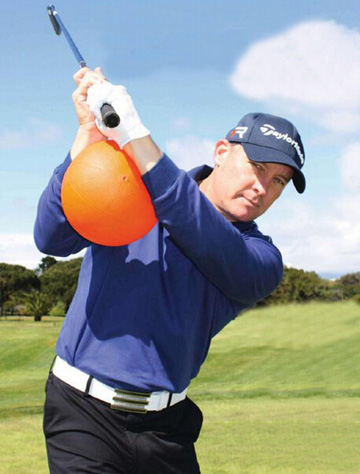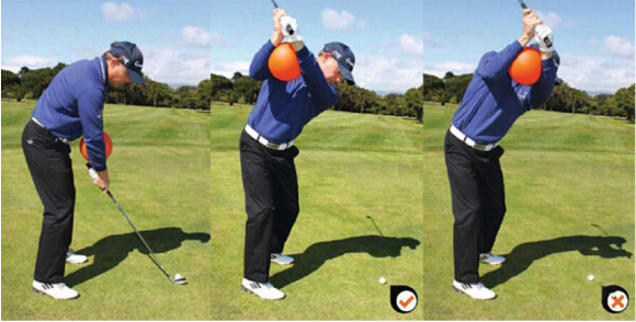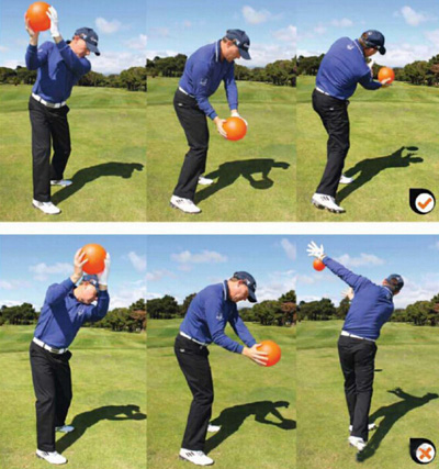 橙色的球的移动轨迹代表的是双手的运动轨迹。正确的操作是不断练习起杆至顶点,然后像橄榄球传球一样的动作。如果在起杆时你的双手是沿着正确的轨迹,你就能笔直地传出球,否则球会被向左打出。当然,正确的髋部肩部转动能够帮助双手在挥杆时处于正确的位置。