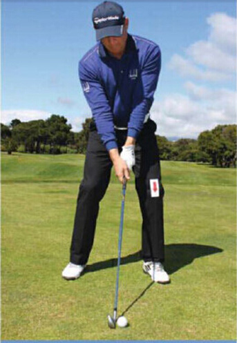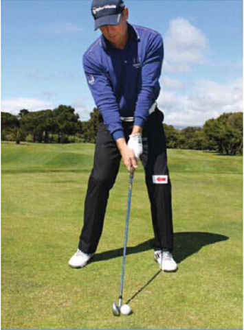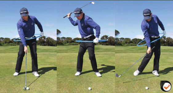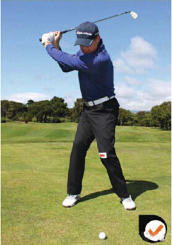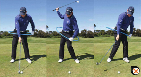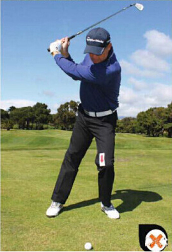 你需要确保在起杆时左膝向右膝移动(见正确图例),这有助于将身体重心转移至右侧,同时保持头部在球后方。如果做到这一步,那么在下杆时,左膝能够恢复到刚开始时的位置,而左髋会提起,以使右肩在下巴下移动,保证球杆在正确的挥杆平面上挥动。
