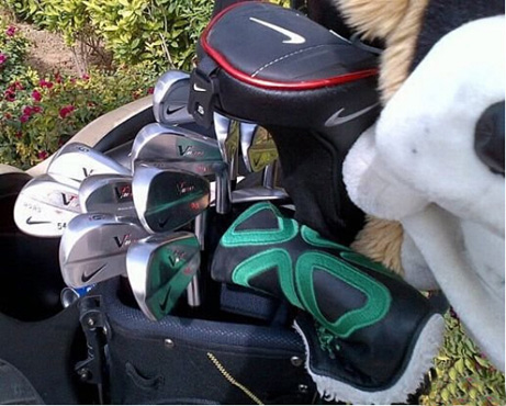 看上去Nike的推杆就藏在这个斯科蒂的杆头套里。不过眼尖的人会发现在铁杆后面还有一个印着NIKE标志的杆头套,耐克的推杆应该被藏在里面。或许就像老虎-伍兹一样,罗里会选择使用这两根推杆,但是根据耐克的市场规定,他们应该不允许在球包里出现斯科蒂的杆头套。