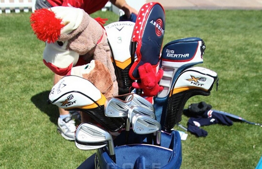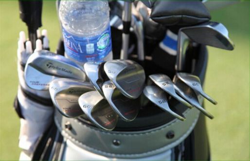 在球包中一共有15根球杆。包括Nike VR II Pro blades,看上去小麦还在Pro Combocavity back 长铁杆、3号球道木和5号球道木之间选择。而46, 50 和54度挖起杆则刻着“罗里的”(Rors)字样。当然耐克标志的一号木杆头套也在其中。